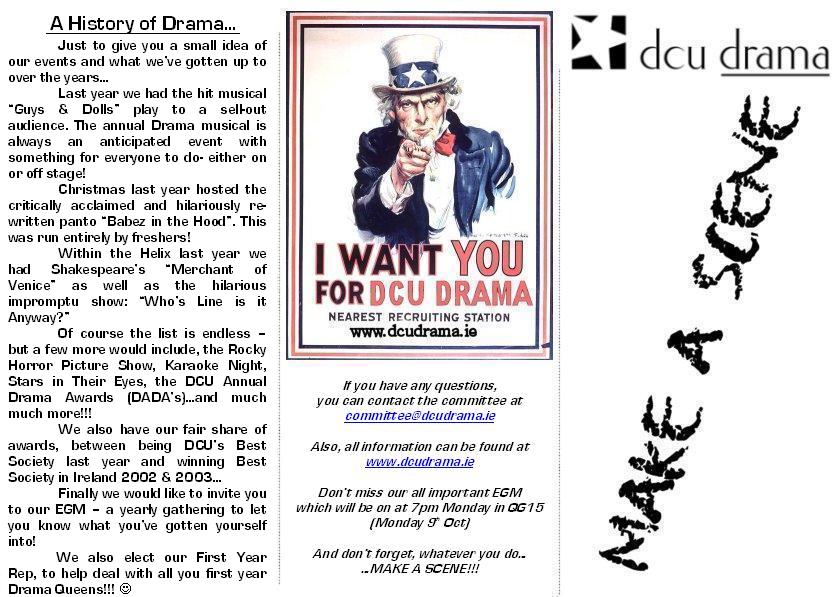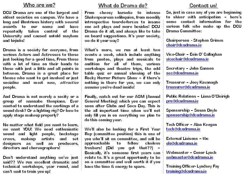 Hey guys, Liana has made up freshers flyers but he computer is *fucked* so she's doing her best to try send them and whatnot. In the meantime myself and Suz made up substitutes which aren't as good but will do if we get stuck! Check them out though... Eoin- what time tomorrow are we packing the bags? (and could people try to get there?) Also, could we move the meeting back to like 6-ish? Its just that 8 is late to be having it and since we'll primarily be discussing the musical I can see the meeting going on... and on... and on... and on...and on... and on...and on... and on...and on... and on...and on... and on...and on... and on...and on... and on...and on... and on...and on... and on...and on... and on...and on... and on...and on... and on...and on... and on...and on... and on...and on... and on...and on... and on...and on... and on...and on... and on...and on... and on...... I propose 6 unless for some specific reason its got to be 8? Also, e-mail John with things for the agenda. AND I propose the EGM be for Monday October 9th. Thats week 3... same as last year. It worked on that day i think it'll work again? Peace and Love... and all things furry... Steve -- Stephen Grimes Applied Physics DCU Drama Chair 085 7079768 55456550