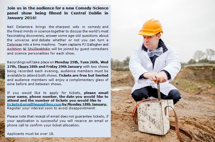 Greetings from Eureka’s H.Q., I'm contacting you on behalf of RTE 2’s new Comedy Science panel show ‘Eureka! - The Big Bang Query’ which is looking to invite both yourself and your society to be part of our studio audience this January. *Neil Delamere* will be joined nightly by team captains *PJ Gallagher* and *Dr Aoibhinn Ni Shúilleabháin *as they battle it out with their teams of guest comedians and science personalities to answer some of the most pressing questions about our universe and pose some comedic theories of their own. Recordings will take place on Monday 25th, Tues 26th, Wed 27th, Thurs 28th and Friday 29th January with two shows being recorded each evening, audience members will enjoy a complimentary glass of wine before and between shows. If you think this may be something that you or your society may enjoy I'd be delighted if you could spread the word by maybe sending an email to your colleagues or by posting our poster which I have attached to your society Facebook page as it promises to be a great FREE night out after your exams this January, Many thanks in advance and I look forward to hearing back from you, All the best, Aisling *Show Blurb* ‘Eureka! - The Big Bang Query’ is a brand new Comedy-Science panel show for RTÉ Two television. It will see *Neil Delamere* bringing the sharpest wits in comedy and the finest minds in science together to discuss the world’s most fascinating discoveries, answer some age old questions about the universe and debate whether or not you can turn a Delorean into a time machine. Team captains *PJ Gallagher* and *Dr. Aoibhinn Ni Shúilleabháin* will be joined by guest comedians and science personalities for each show. Recordings will take place in The old John Player Factory in Dublin 8 with recordings taking place on Monday 25th, Tues 26th, Wed 27th, Thurs 28th and Friday 29th January with two shows being recorded each evening. If you like to be part of the Studio Audience then please email tickets@mindthegapfilms.com by January 18th for further information.